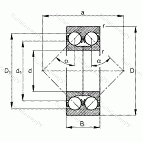 Основные размеры по DIN 628-3, двухрядные, разъемные, с разъемным внутренним кольцом, угол контакта α = 45°