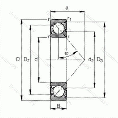 Основные размеры по DIN 628-1, угол контакта α = 40°, контактные уплотнения с двух сторон