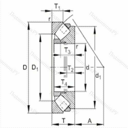 - Обладает более широкой зоной передачи усилий в сравнении с шарикоподшипниковыми аналогами, однако предназначен исключительно для работы с малыми скоростями вращения.