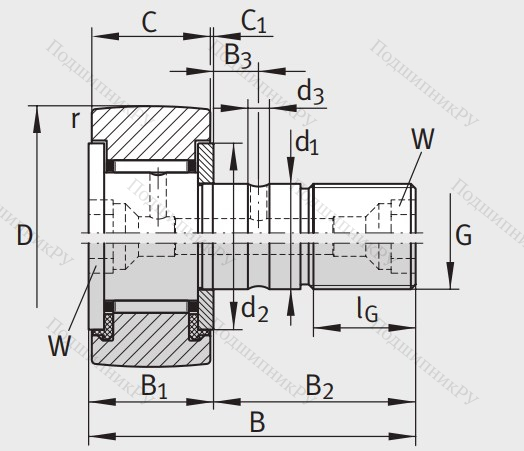 Подшипник KR 30 PP его конструкция практически полностью повторяет роликовые подшипниковые системы за исключением наличия втулки, которая является одновременно дорожкой качения, выполняя тем самым функцию отсутствующей внутренней шины (движение осуществляется по утолщенной головке стержня). На поверхности детали находится смазочный канал, через который осуществляется обслуживание (загрузка смазочного материала). Наружная шина утолщена и имеет сферическую (выпуклую) форму. Может комплектоваться игольчатыми роликами или другими подшипниковыми телами.