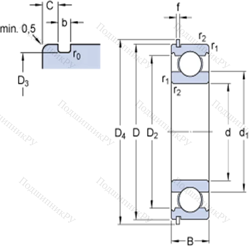 Однорядные радиальные шарикоподшипники с канавкой под стопорное кольцо 6305 NR