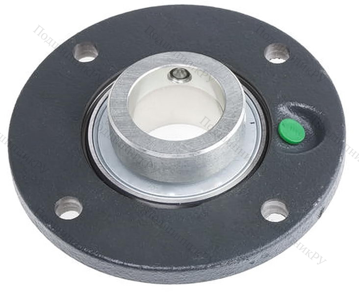 Фланцевая гильза из чугуна или стали оснащена корпусным радиальным шарикоподшипником UC-серии, имеющим внутреннюю обойму удлиненного вида и винтовой стопорной крепеж. Монтаж детали осуществляется методом подгонки.
